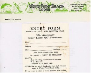 By September 1984 the organization had 60 charter members. The first tournament was held at Liverpool and White Point Lodge Sept. 4-5, 1984. Nancy Steele, Lunenburg, and Jean Hemeon, Liverpool, were tournament chairs. The fee covered 9 holes on Wednesday, overnight and breakfast at White Point, and 18 holes on Thursday, lunch included (sandwich and drink). The first winner was Kay Verge, a Liverpool club champion who also played on two provincial women’s senior teams.