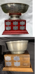 The championship trophy (Low Gross of the Field) was donated in 1984 by Lib Connor. It is a lovely mounted fruit bowl with a plastic cover.
